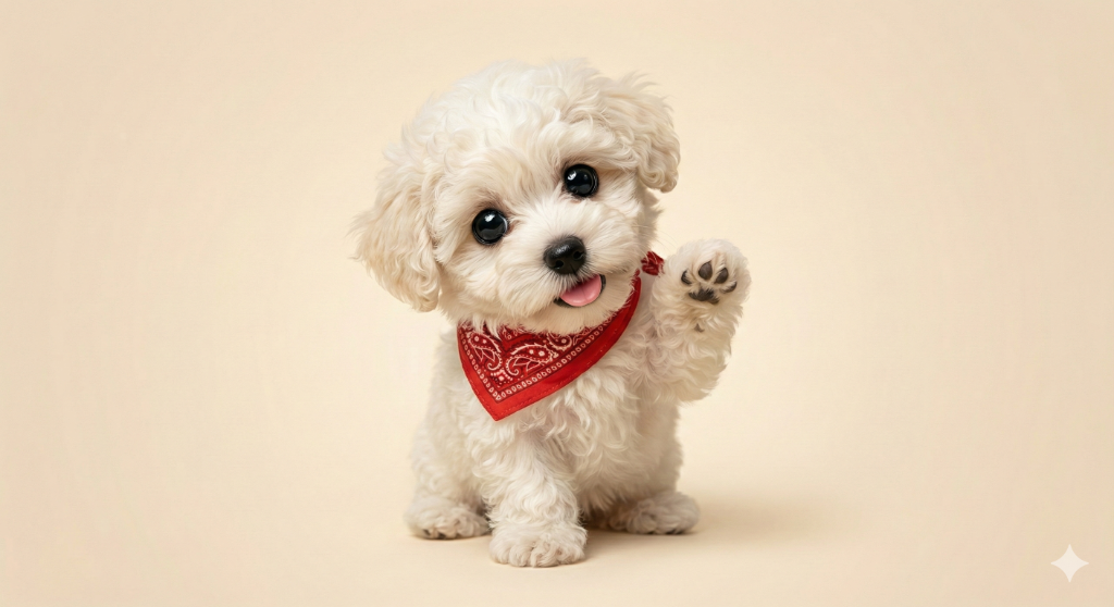 긍정 에너지 폭발하는 말티푸. 빨간 반다나를 하고 화상 회의 때마다 짖어서 방해하지만, 집사가 우울해 보이면 제일 먼저 다가와 위로하는 사랑스러운 껌딱지 강아지.